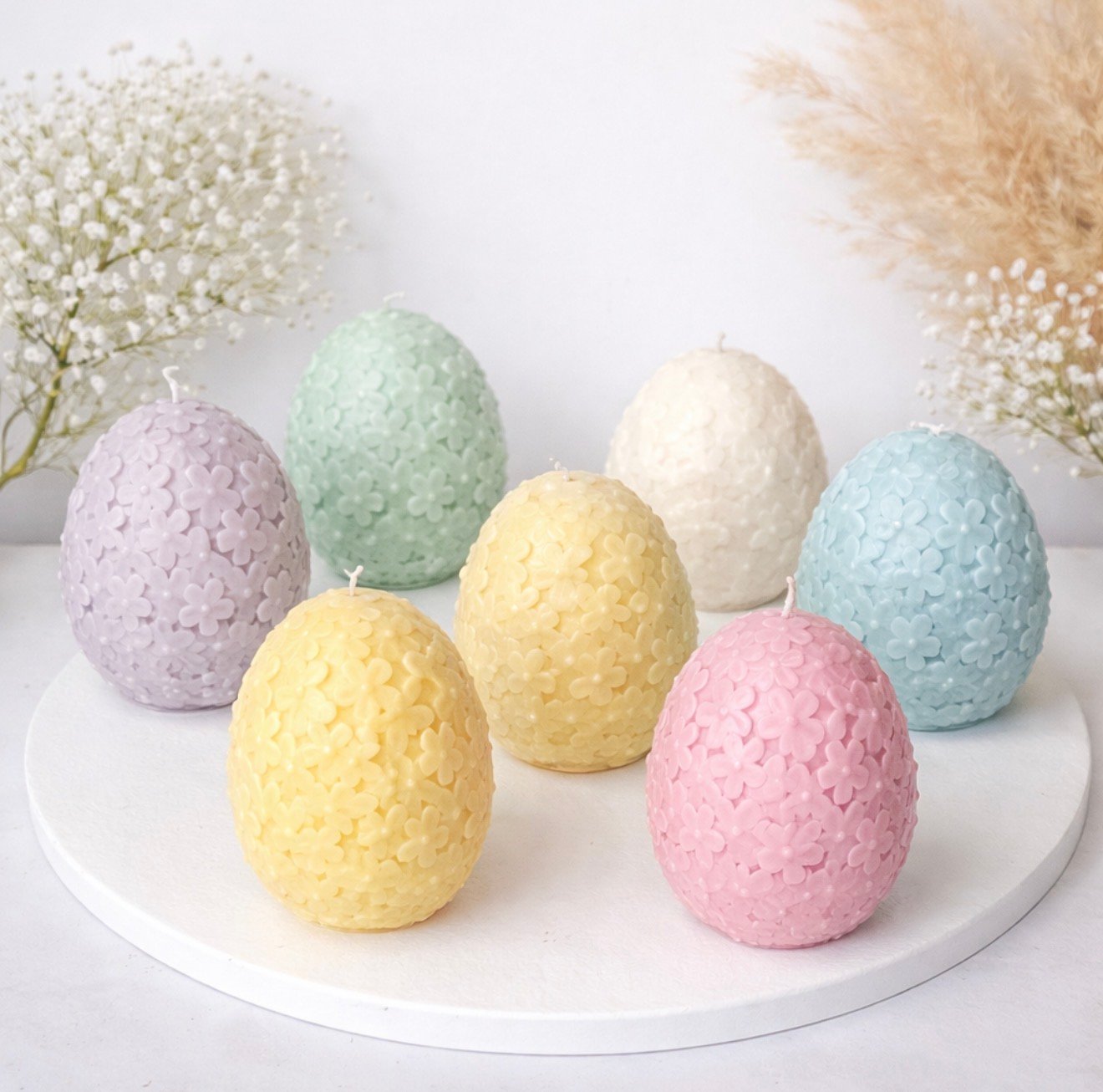 Χειροποίητο διακοσμητικό κερί σόγιας σε σχήμα αυγού, διακοσμημένο με μικρά ανάγλυφα λουλούδια που δημιουργούν μια ιδιαίτερη και κομψή υφή σε όλη την επιφάνειά του. Το λεπτομερές floral σχέδιο χαρίζει στο κερί μια ρομαντική και ανοιξιάτικη αισθητική.