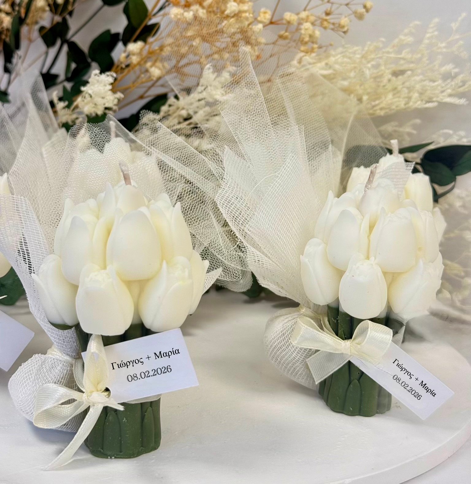 Η μπομπονιέρα κερί ανθοδέσμη είναι χειροποίητη και κατασκευασμένη από φυσικό κερί σόγιας, προσφέροντας καθαρή καύση και απαλή ατμόσφαιρα. Ο ρομαντικός σχεδιασμός της ανθοδέσμης την καθιστά ένα ξεχωριστό ενθύμιο που δεν μαραίνεται, αλλά μένει για πάντα ως ανάμνηση αγάπης και χαράς.