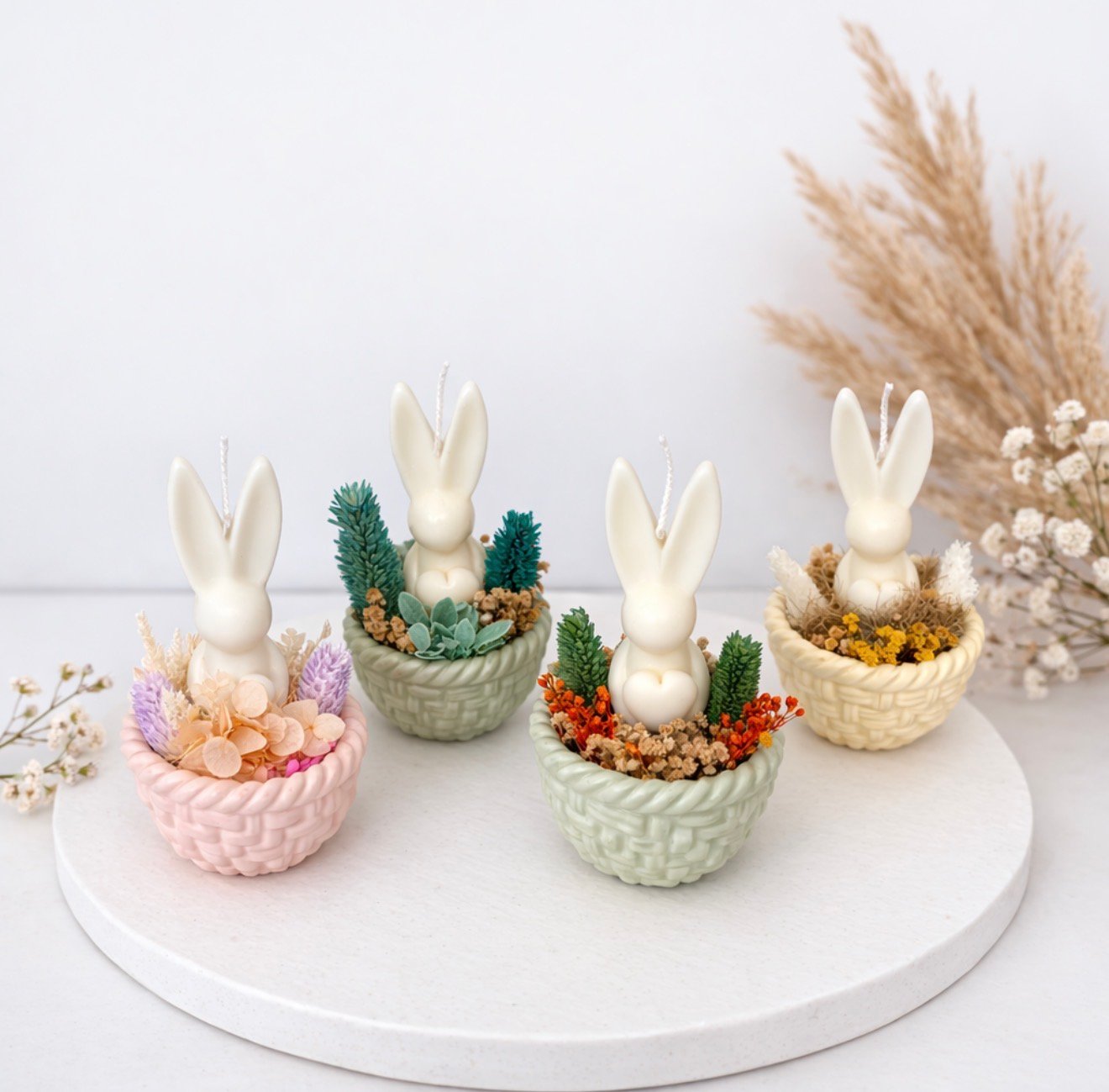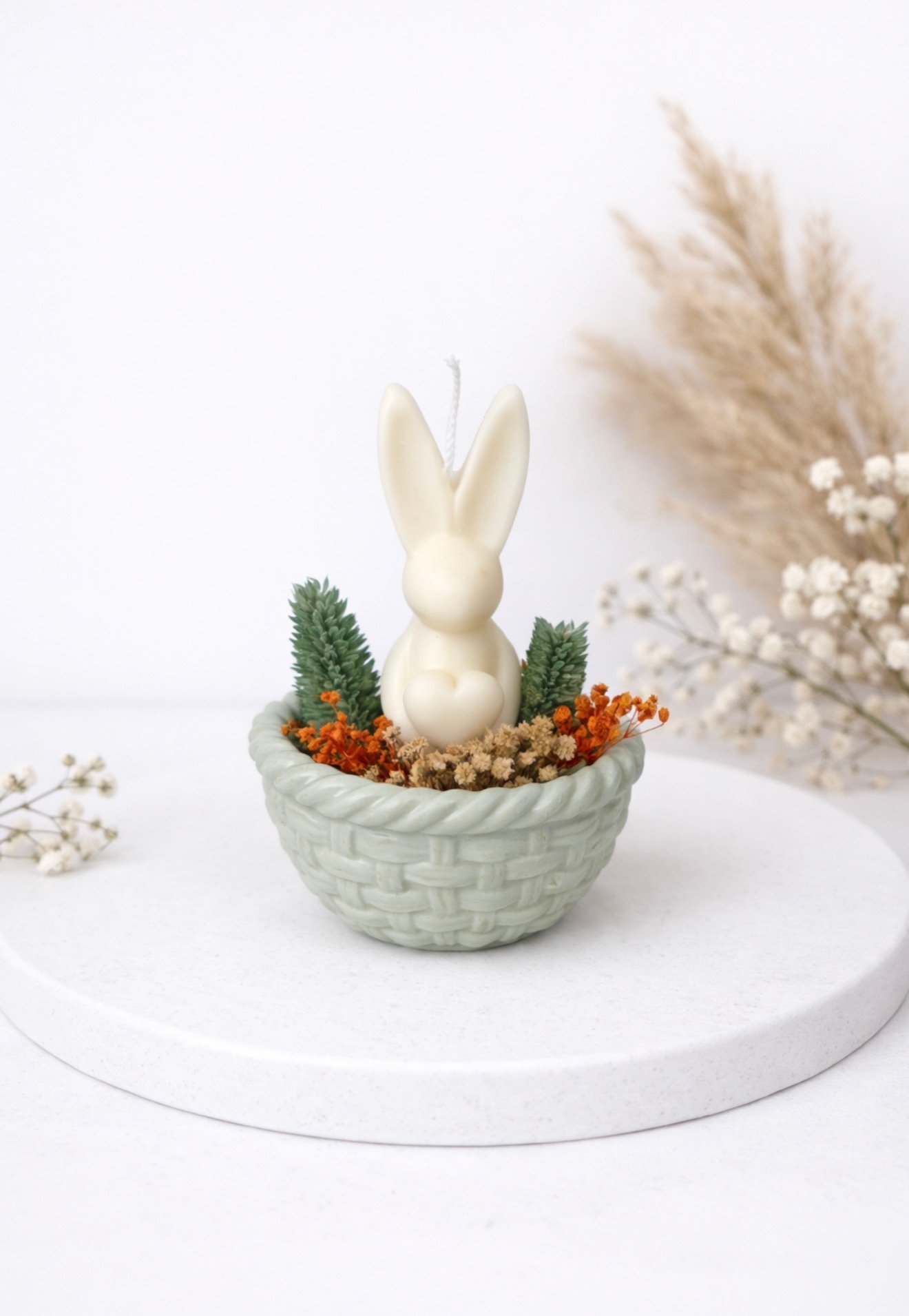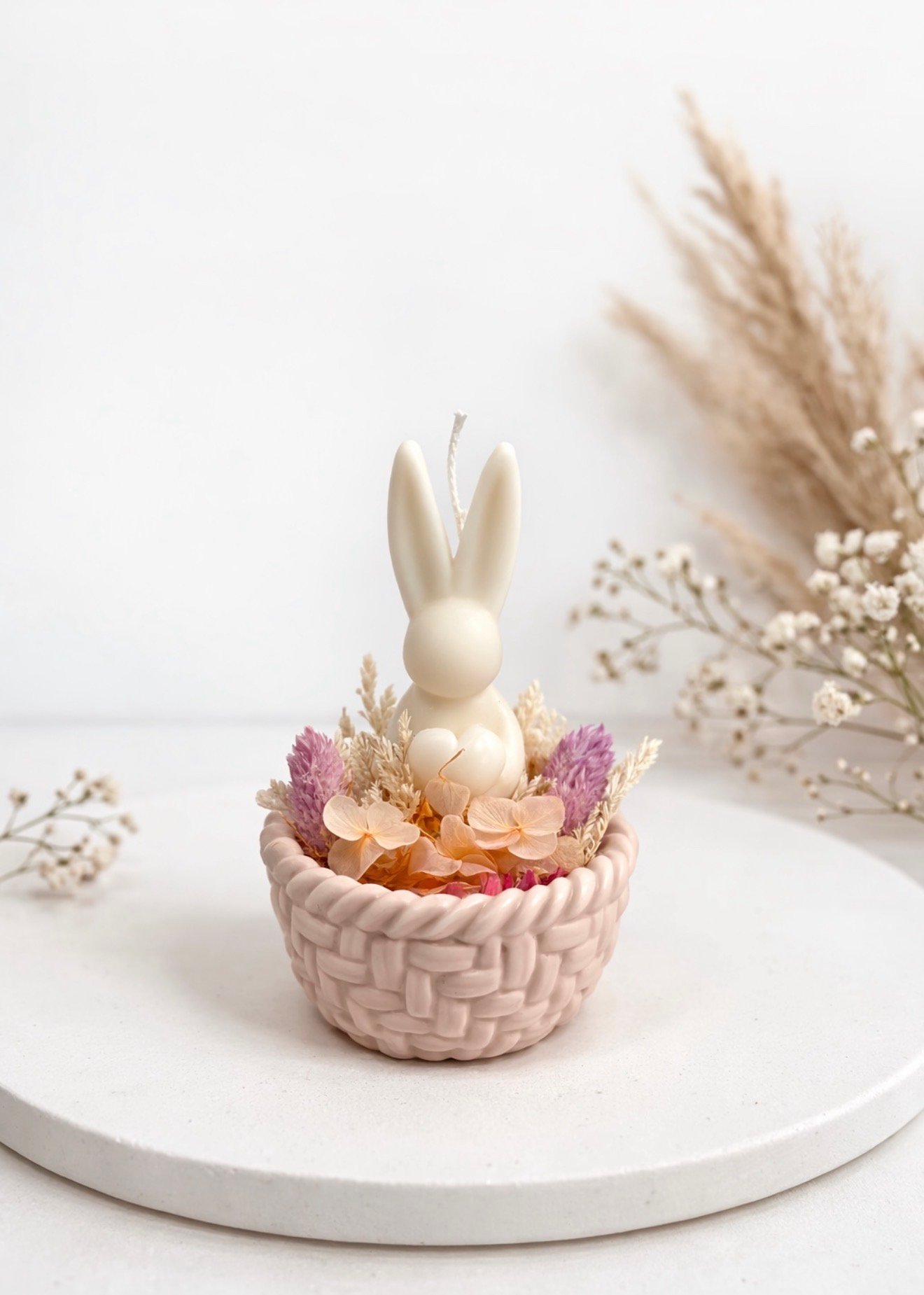 Χειροποίητο διακοσμητικό κερί σόγιας σε σχήμα λαγουδάκι, τοποθετημένο μέσα σε πορσελάνινο καλαθάκι και διακοσμημένο με αποξηραμένα λουλούδια. Μια όμορφη πασχαλινή σύνθεση που συνδυάζει φυσικά υλικά και minimal αισθητική.