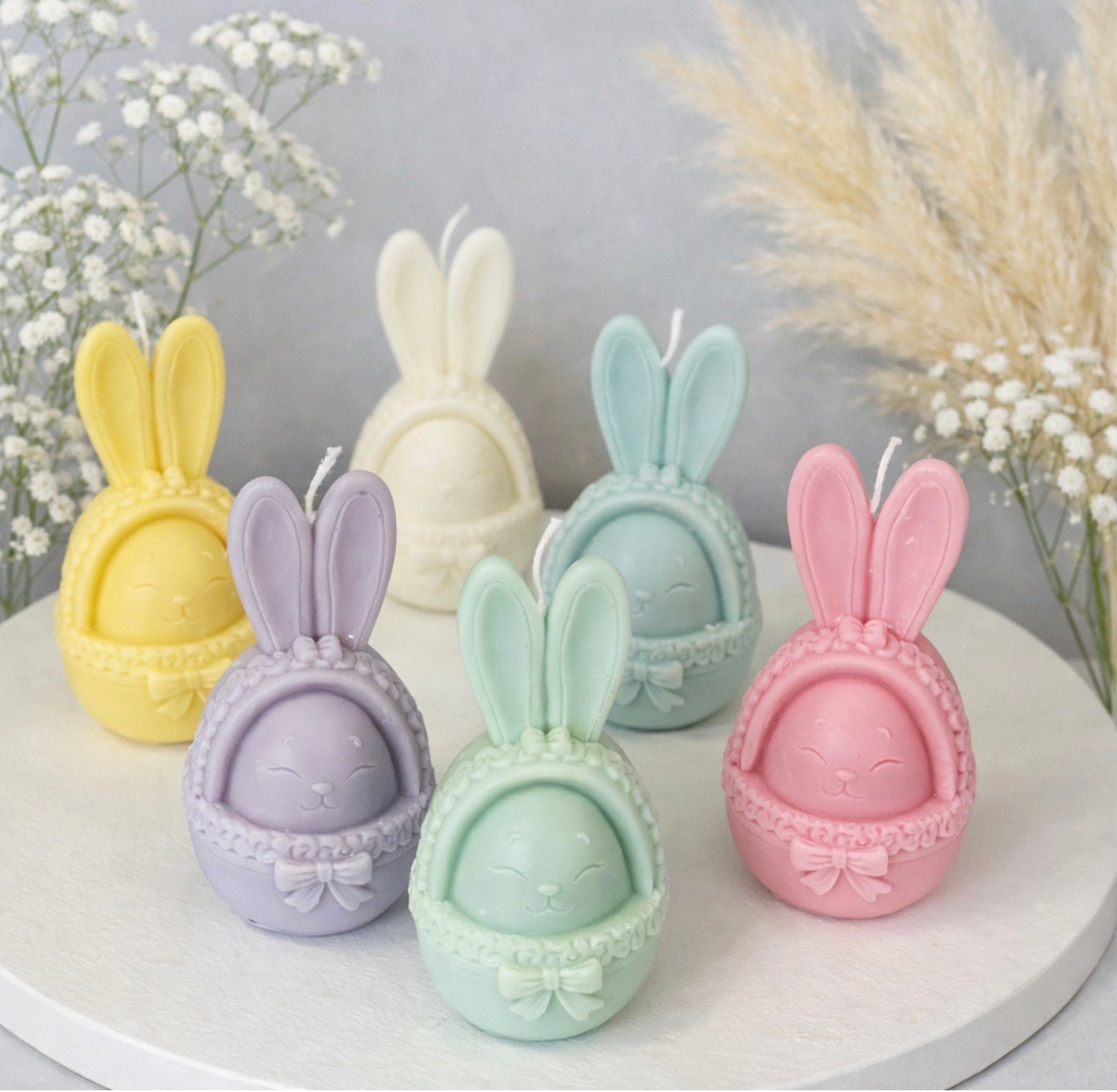 Χειροποίητο διακοσμητικό κερί σόγιας σε σχήμα μικρού λαγουδιού μέσα σε διακοσμητικό καλαθάκι, σε απαλές παστέλ αποχρώσεις που δημιουργούν μια γλυκιά και ανοιξιάτικη αισθητική. Το χαριτωμένο σχέδιο με τα αυτιά του λαγού και τη διακριτική κορδέλα στο μπροστινό μέρος δίνει μια ιδιαίτερα παιχνιδιάρικη αλλά και κομψή εμφάνιση.