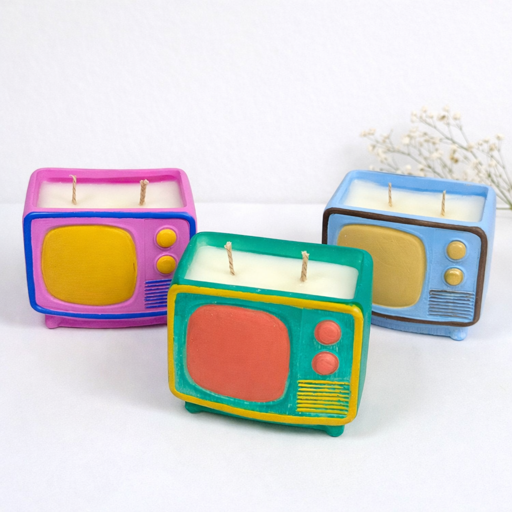 Χειροποίητο κερί σόγιας σε πορσελάνινο δοχείο σε σχήμα ρετρό τηλεόρασης. Ζωγραφισμένο στο χέρι και διαθέσιμο σε διαφορετικές αποχρώσεις με δυνατότητα προσαρμογής χρωμάτων.
