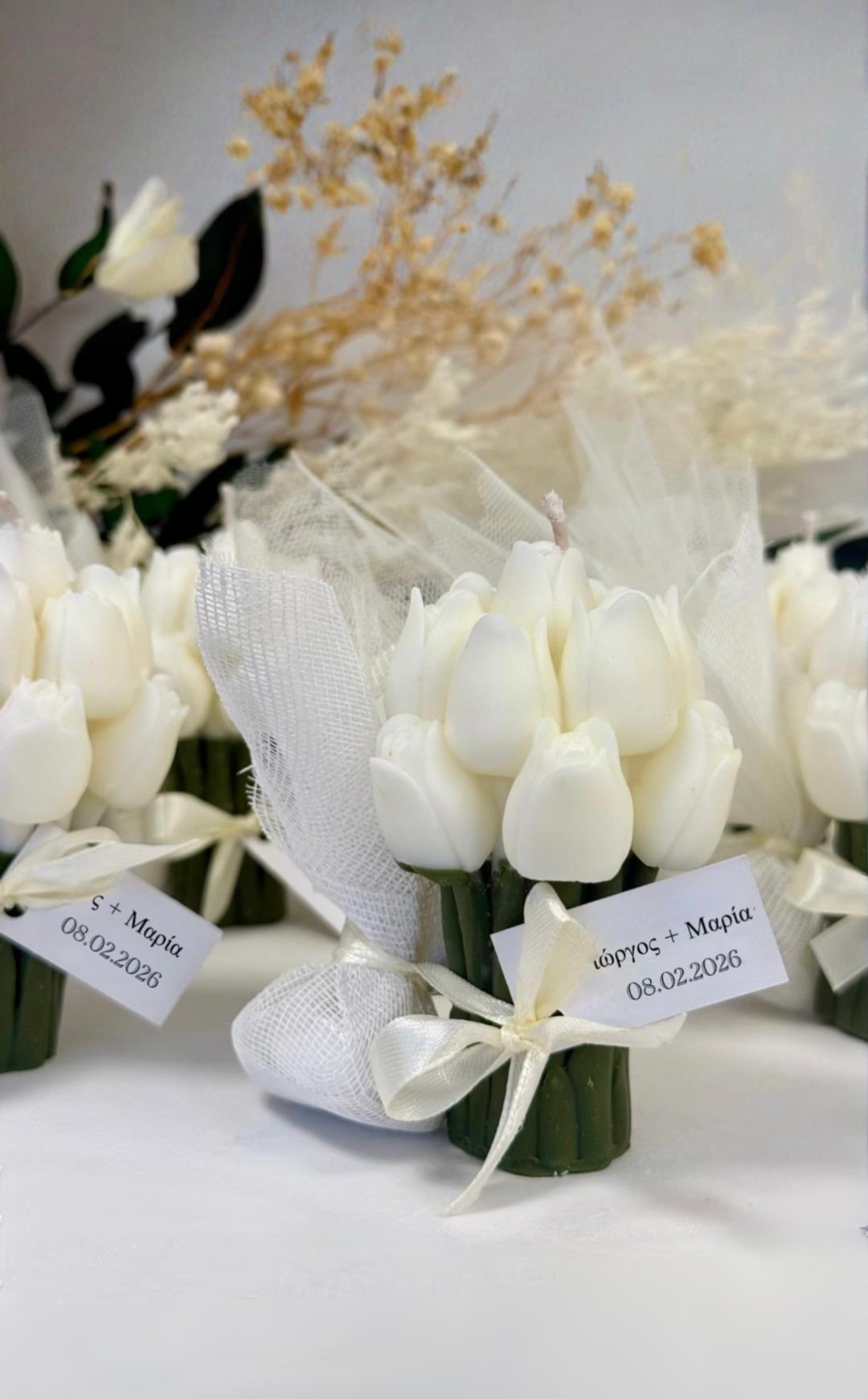 Η μπομπονιέρα κερί ανθοδέσμη είναι χειροποίητη και κατασκευασμένη από φυσικό κερί σόγιας, προσφέροντας καθαρή καύση και απαλή ατμόσφαιρα. Ο ρομαντικός σχεδιασμός της ανθοδέσμης την καθιστά ένα ξεχωριστό ενθύμιο που δεν μαραίνεται, αλλά μένει για πάντα ως ανάμνηση αγάπης και χαράς.