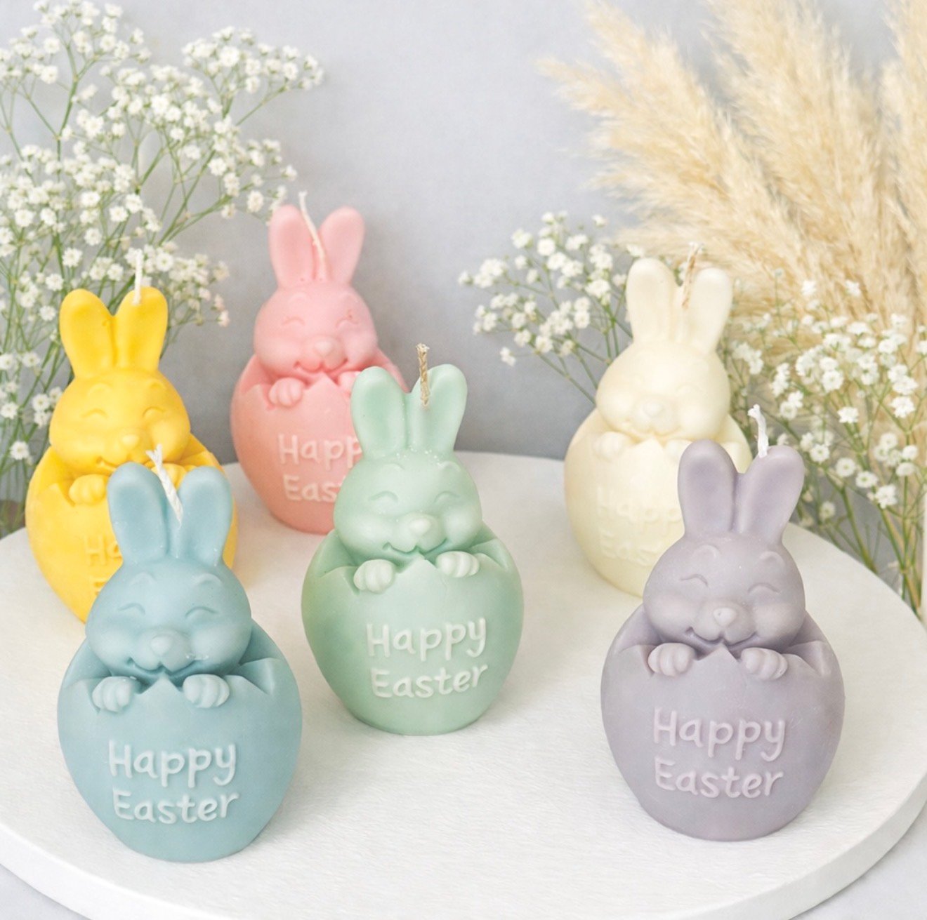 Διακοσμητικό κερί σόγιας με λαγουδάκι που ξεπροβάλλει από αυγό και την επιγραφή “Happy Easter”. Ένα χαριτωμένο κερί σε παστέλ αποχρώσεις για ανοιξιάτικη διακόσμηση.