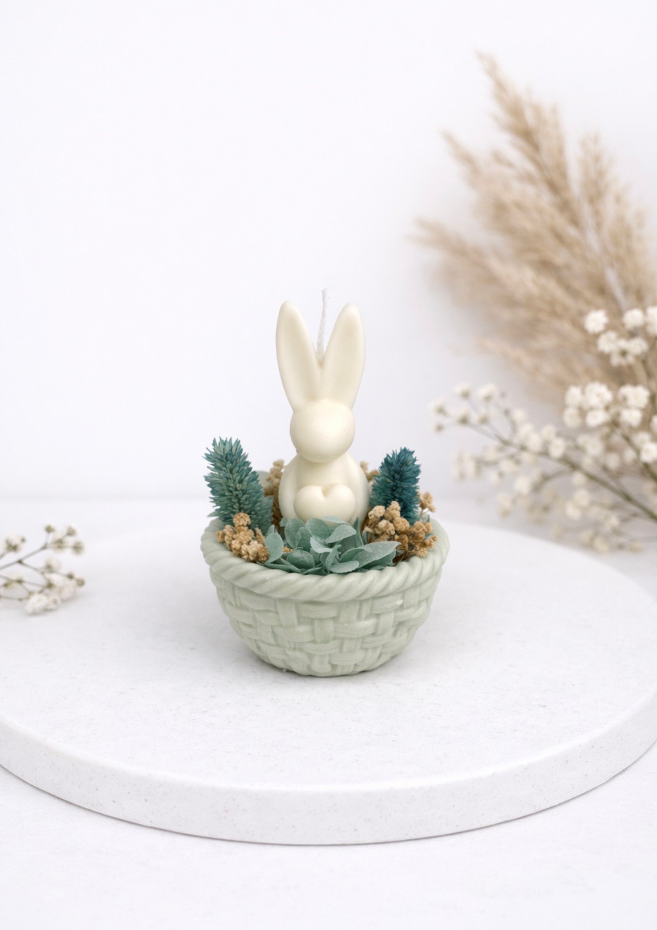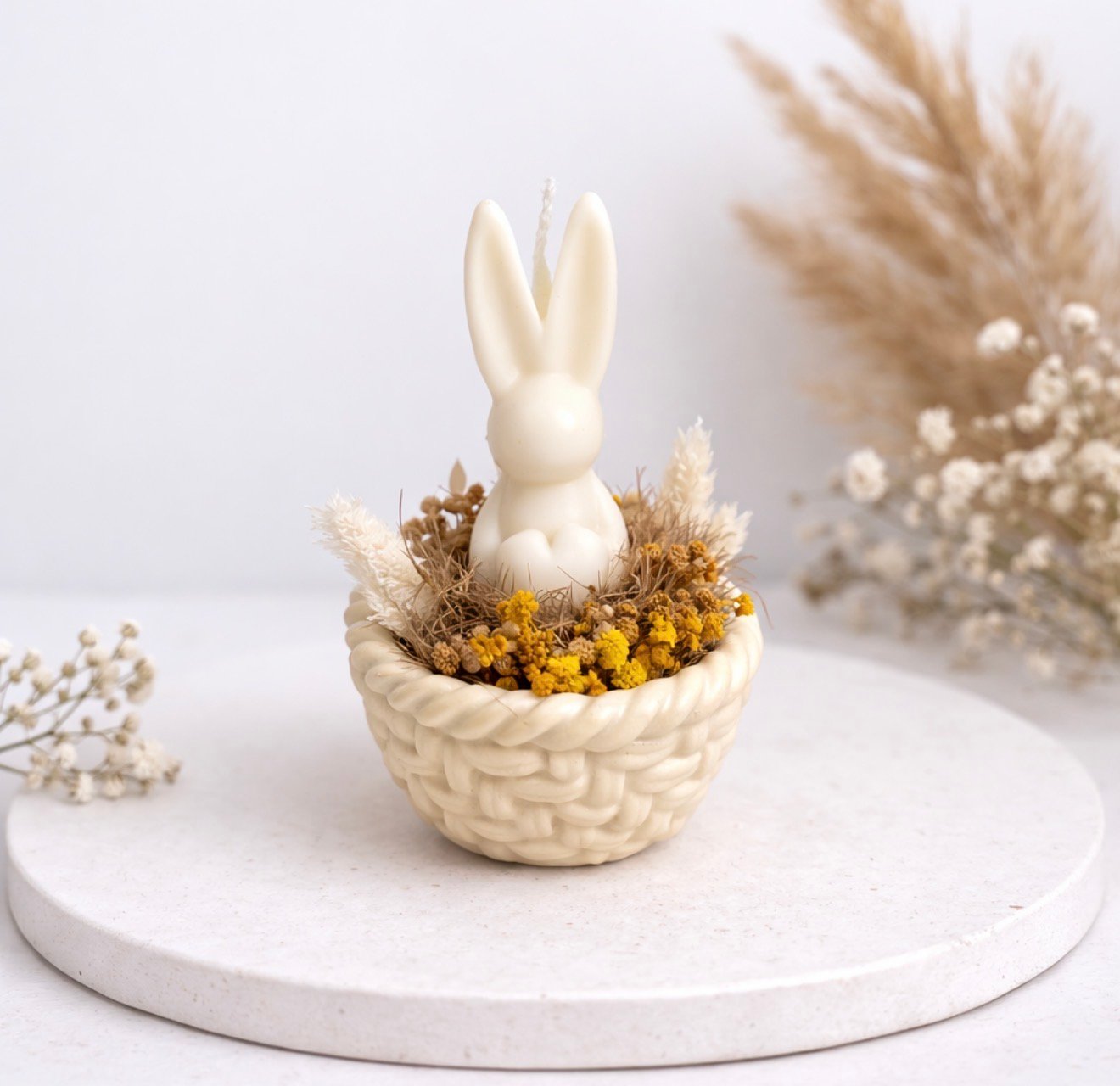 Χειροποίητο διακοσμητικό κερί σόγιας σε σχήμα λαγουδάκι, τοποθετημένο μέσα σε πορσελάνινο καλαθάκι και διακοσμημένο με αποξηραμένα λουλούδια. Μια όμορφη πασχαλινή σύνθεση που συνδυάζει φυσικά υλικά και minimal αισθητική.