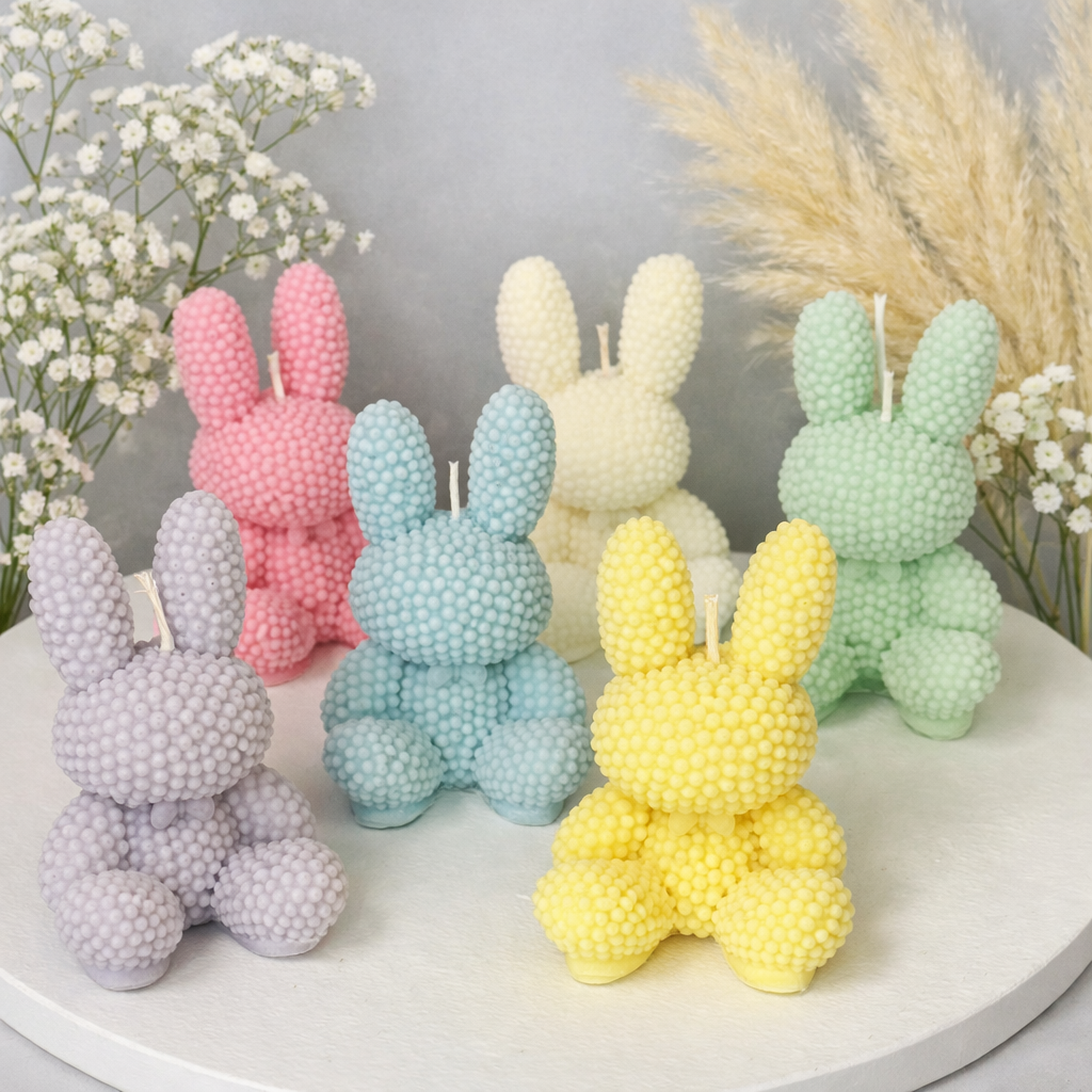 Διακοσμητικό κερί σόγιας σε σχήμα καθιστού λαγουδιού με ιδιαίτερη bubble υφή και παστέλ αποχρώσεις. Ένα μοντέρνο και παιχνιδιάρικο στοιχείο διακόσμησης.