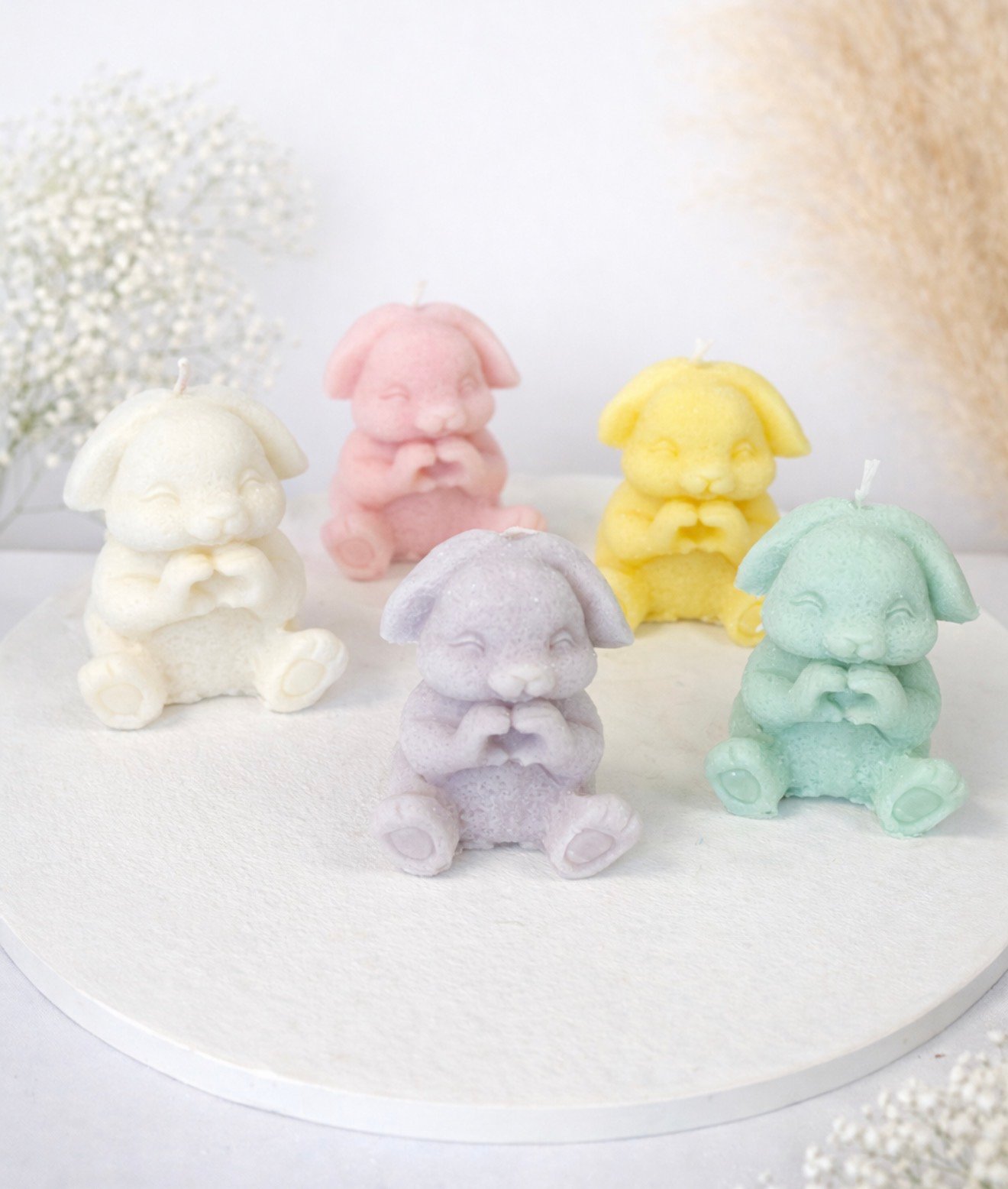 Διακοσμητικό κερί σόγιας σε σχήμα λαγουδιού που κρατά καρδιά, σε απαλές παστέλ αποχρώσεις. Ένα γλυκό και τρυφερό στοιχείο διακόσμησης.
